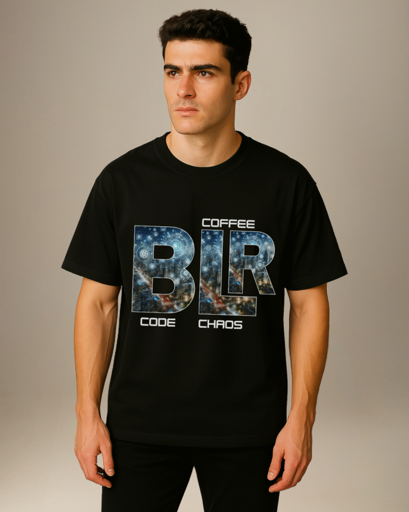 From all-nighters fueled by filter coffee to the beautiful madness of a city that never stops innovating, this oversized tee captures the essence of Bengaluru’s tech life. Whether you’re debugging at dawn, brainstorming the next unicorn, or just navigating the never-ending startup hustle, this shirt is your uniform for organized chaos.