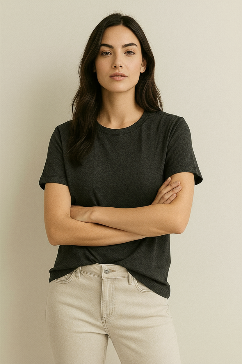 The subtle Antra Melange shade adds a modern twist to a classic neutral, making it perfect for pairing with jeans, shorts, or joggers. Whether lounging at home or stepping out, this tee is your go-to for understated, everyday style.